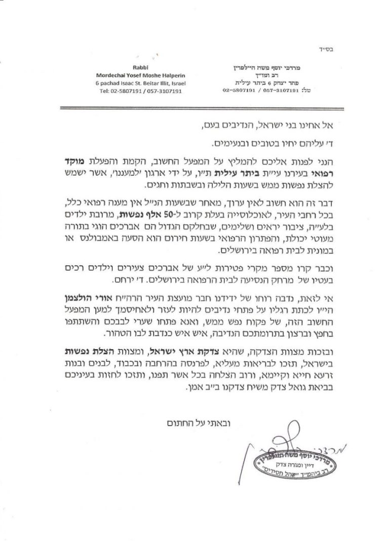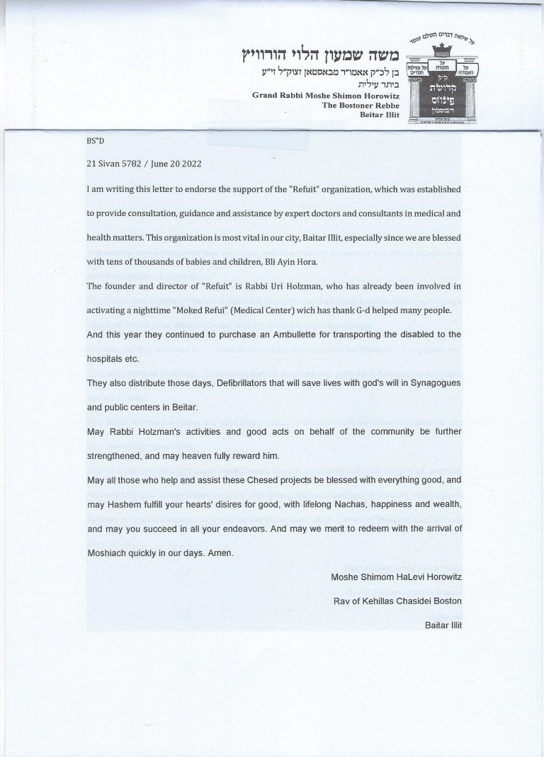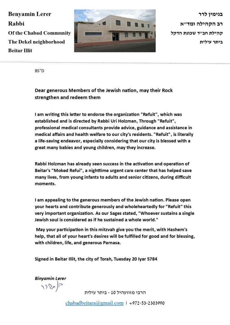 La Refuit Medical Association a été créée dans le but de fournir une aide, des conseils et une orientation aux communautés du conseil régional de Mateh Yehuda et dans la région de Gush Etsyon dans des disciplines médicales qui n’offraient pas ces services dans le passé